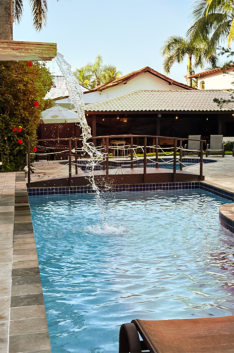 Mergulhe em nossa piscina e aproveite o conforto de um bar à disposição, servindo bebidas refrescantes e deliciosos coquetéis para tornar seu dia ainda mais especial.